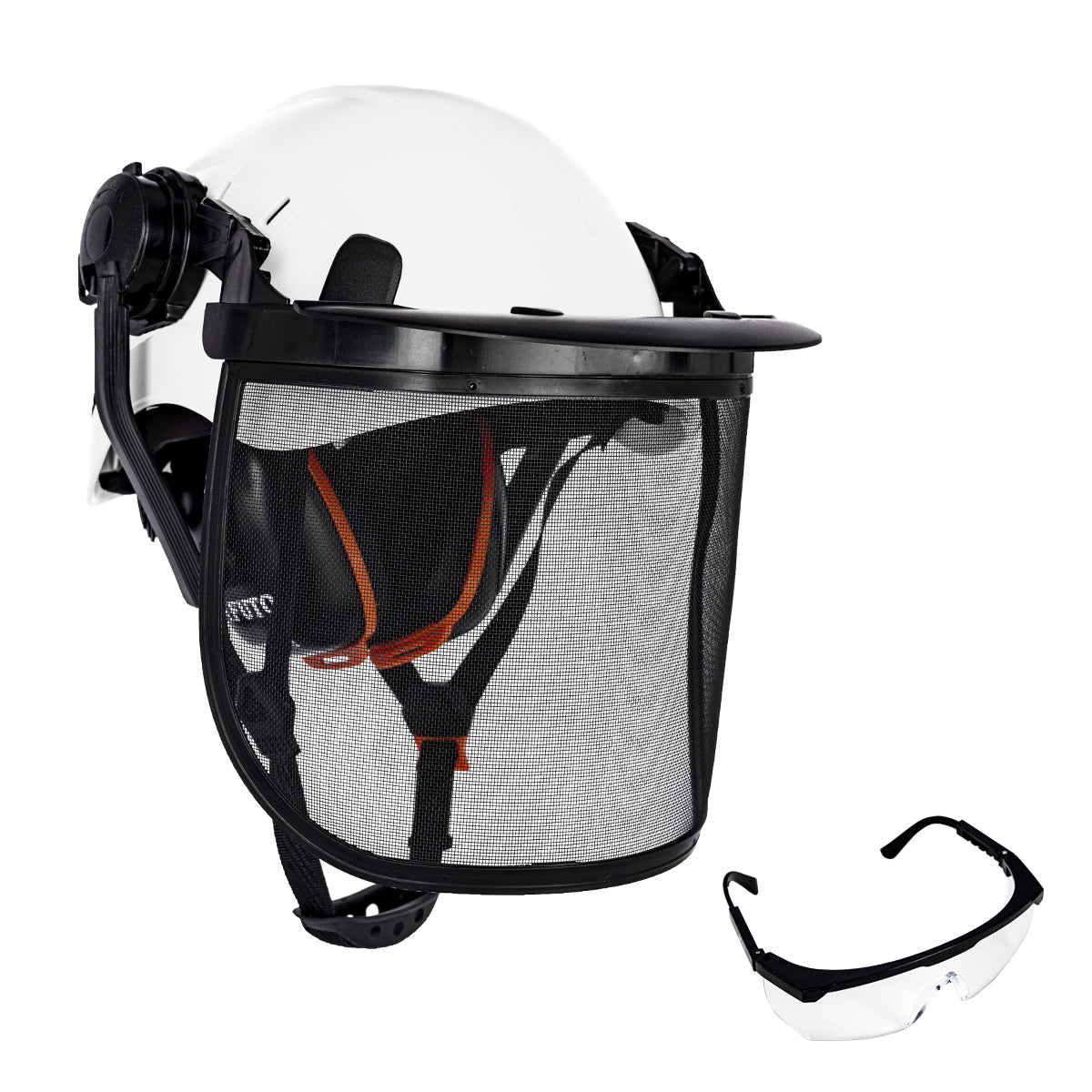 • 【3 IN 1 FORESTRY HELMET WITH ACCESSORIES 】It will come with forestry helmet, face shield, ear muffs and anti-fog safety goggle. The hard hat is made by strong ABS material. It has high impact resistance and can keep your head safe when you are in need in the construction site or garden care use. The 23 dB NRR earmuffs will help block out all sound noise for hearing protection. The flip-up metal mesh visor and anti-fog safety goggles will protect your eyes and face from flying debris.