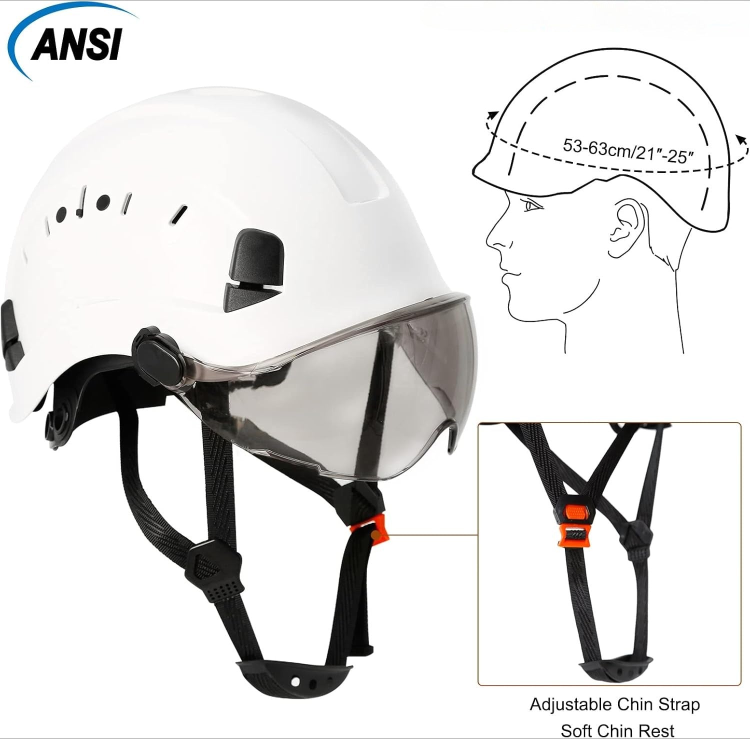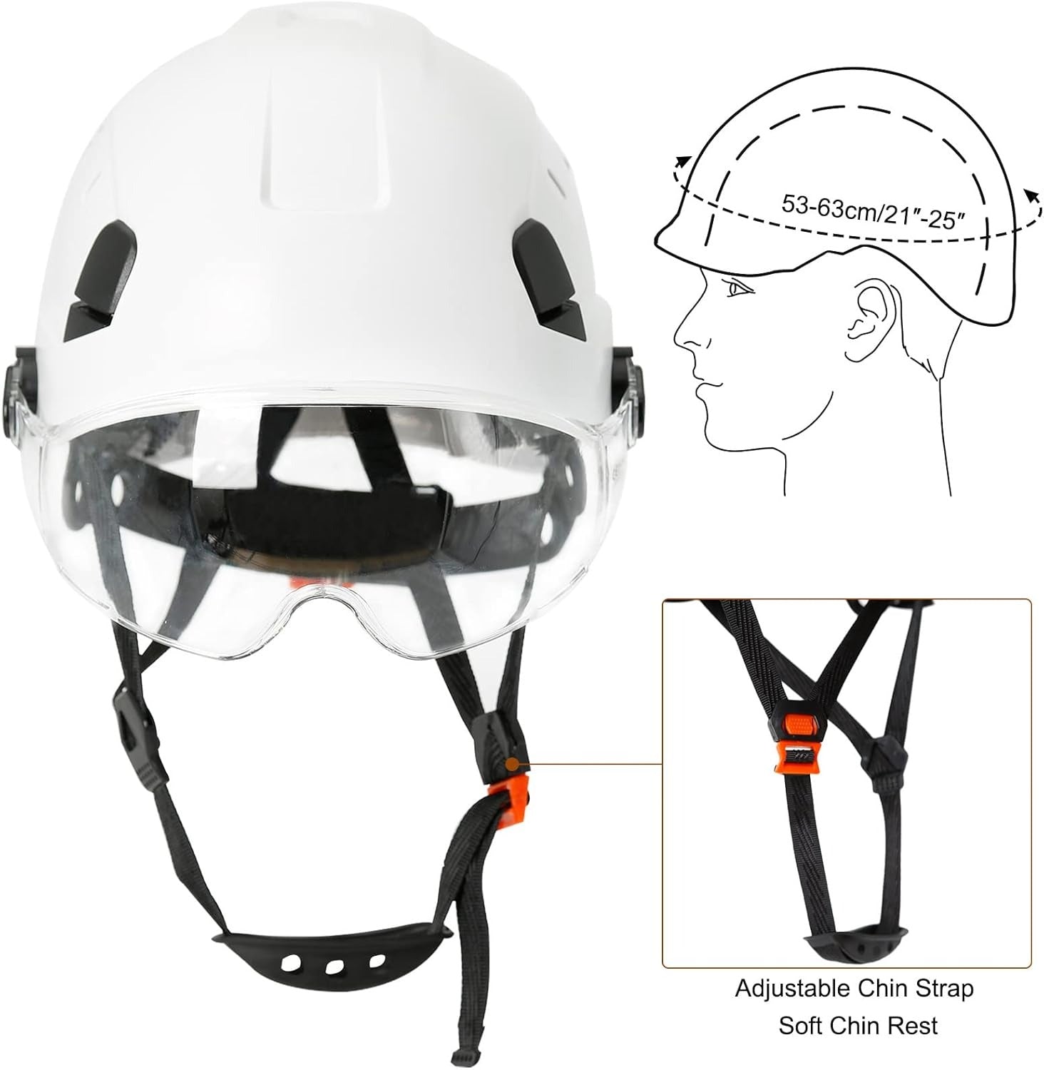 • HIGH QUALITY MATERIAL: The outer shell of the hard hat is made by strong ABS material. It has high impact resistance and can keep your head safe when you in the construction site. The goggle of the hard hat is made by qualified plastic material. You will seize a good view when it was pulled down.